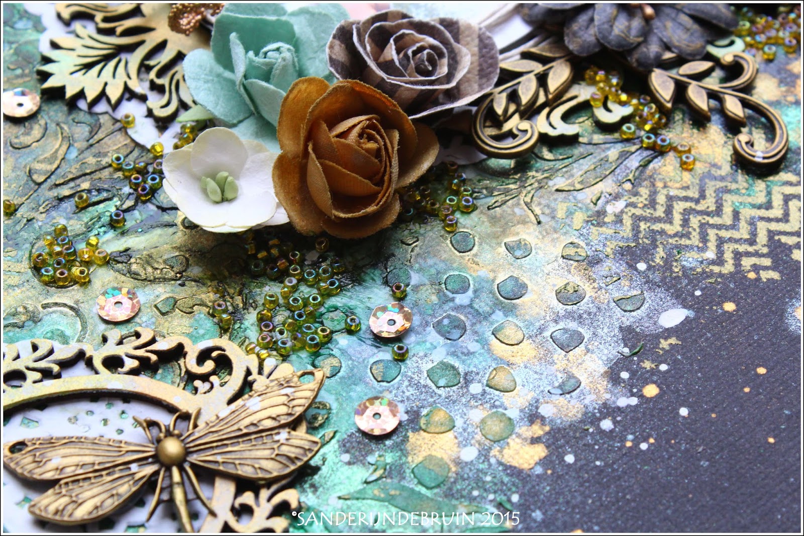 My background is made out of black cardstock, white gesso, modelling paste in combination with stencils, and lots of sprays. I added shimmering sequins and beautiful, shimmering glass beads, wich are a gift from my sweet aunt from Amsterdam ( I got hundreds of little bags in all different shades and colors, such a huge gift!)