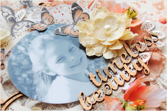 I was asked to be guest designer at Pion Design this month, and I have created this romantic, flowery page for you, with gorgeous Dusty Attic chippies and stencil patterns.